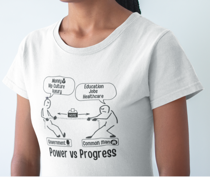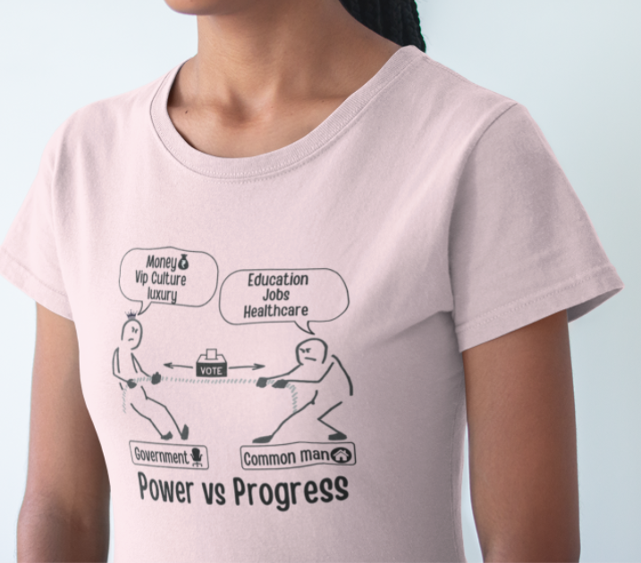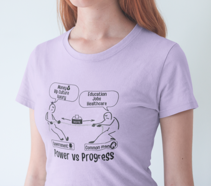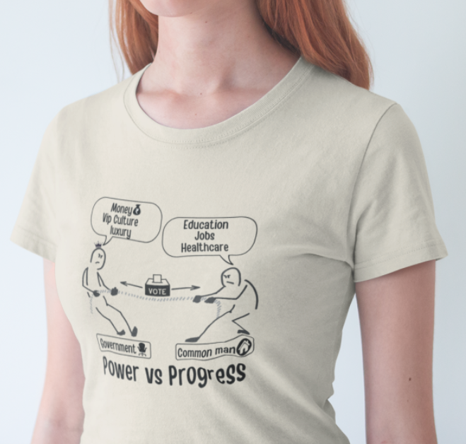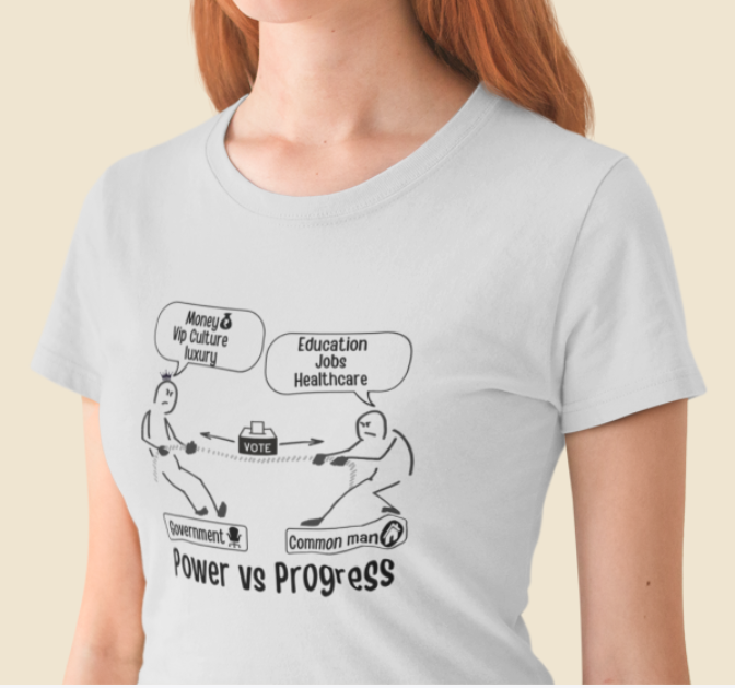 This design hilariously captures the never-ending struggle between the government and the common man. On one side, politicians pull for Money, VIP perks, and Luxury, while on the other, the common man fights for Education, Jobs, and Healthcare. The question remains—who will win this battle, and who will keep pulling forever?