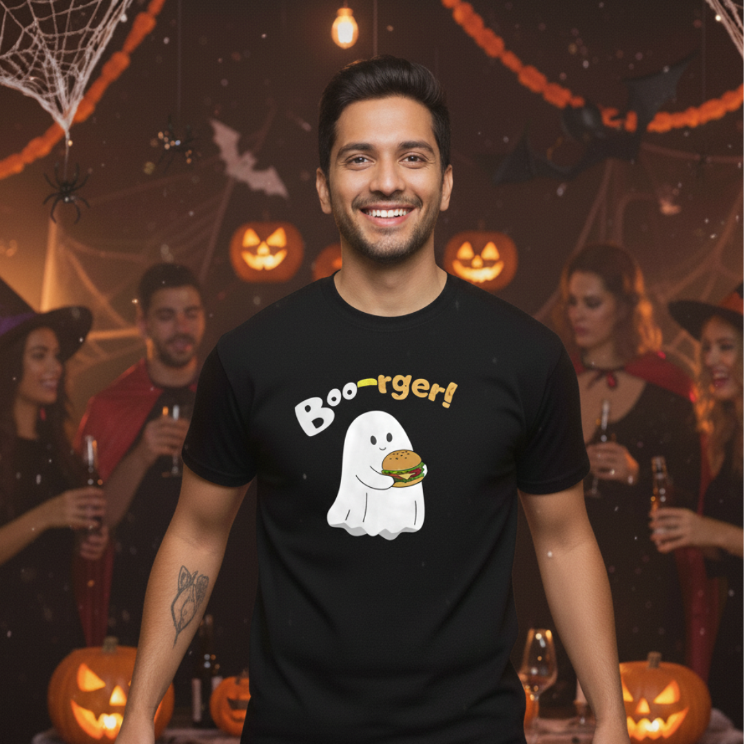 Boo-rger ! Cute Halloween Ghost eating Burger Mens Classic Crew T-Shirt