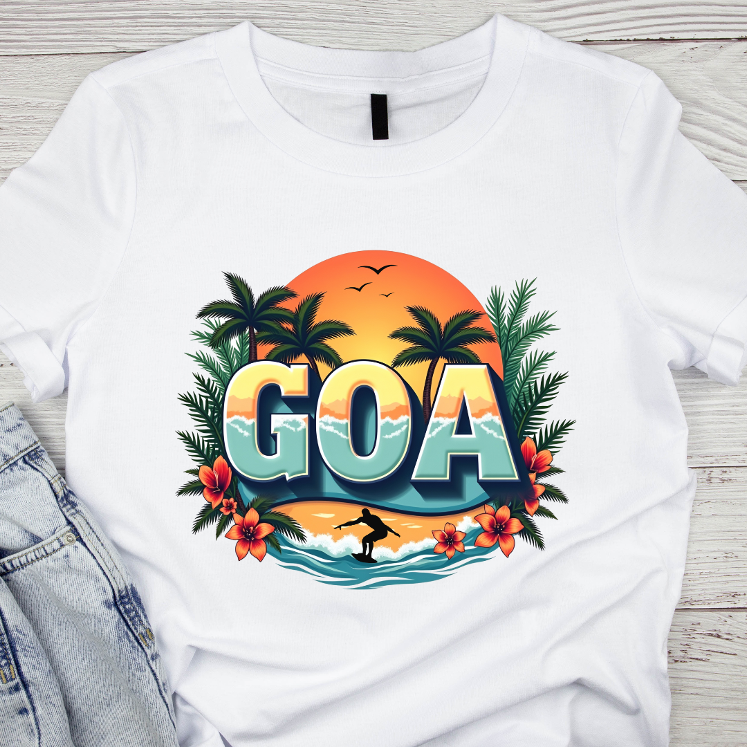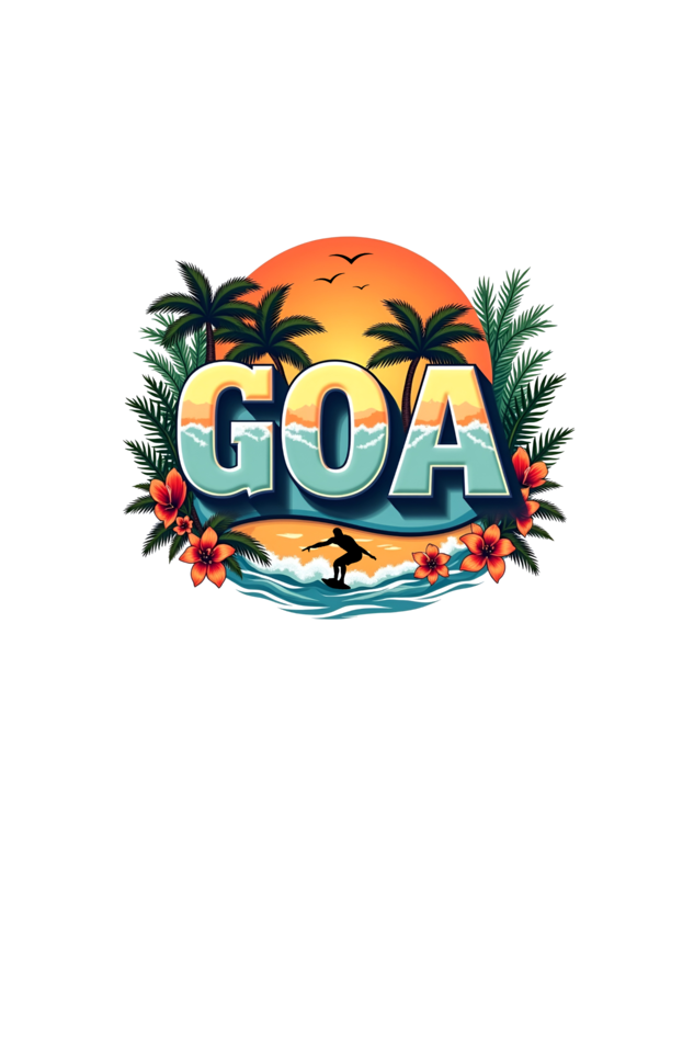 Capture the tropical vibe with this vintage sunset design! It has palm trees, vibrant flowers, and a serene beach scene and's perfect for surfers and Goa lovers. A must-have for your laid-back adventures!"